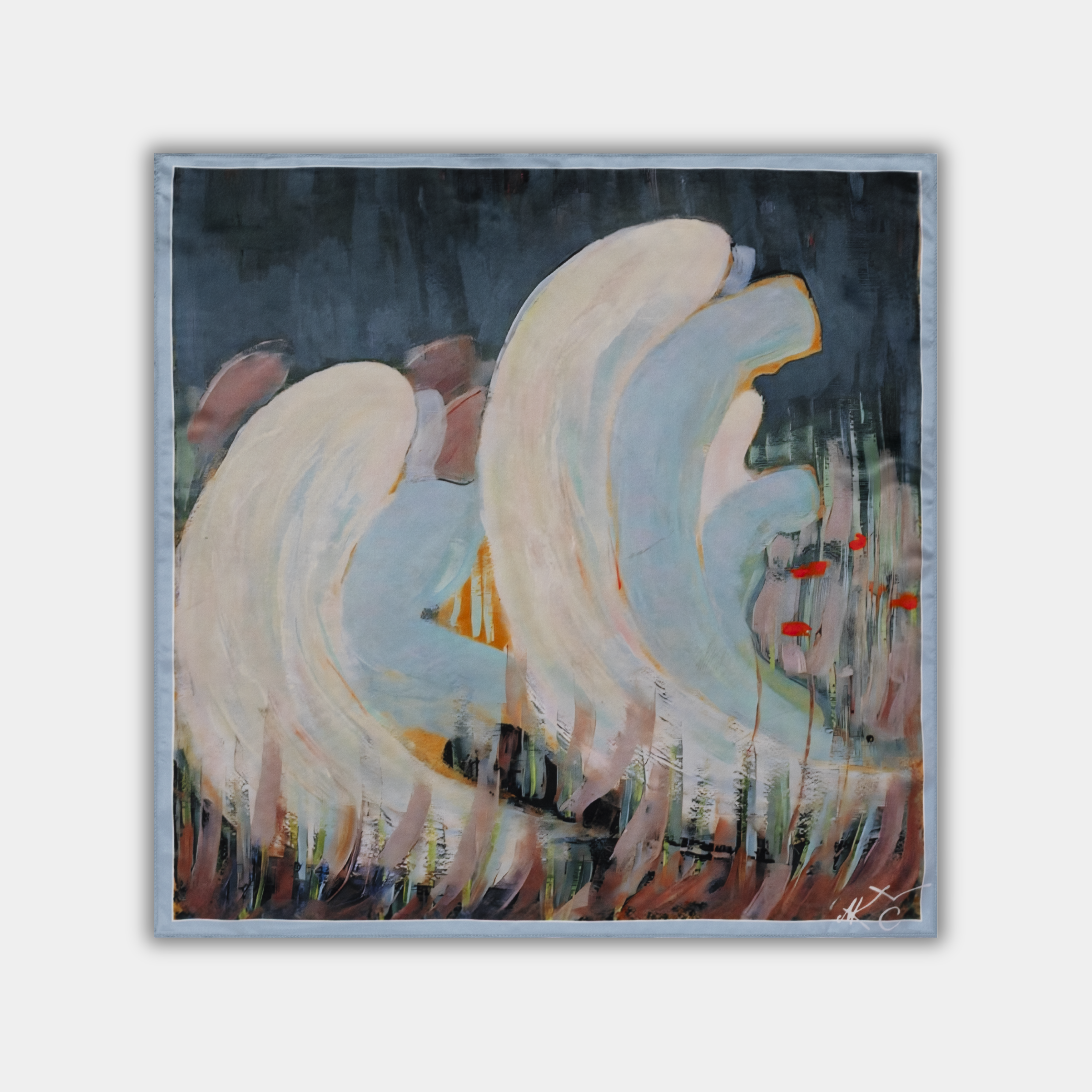 Maalil avaneb salapärane, vaikusest läbi imbunud stseen – valged inglifiguurid, pead õrnade lillede vahel kumardunud, loovad hapruse ja sisemise rahu mulje. Tume taust toob esile heledad vormid ja süvendab teose sügavust ning peent emotsionaalset vaikust.